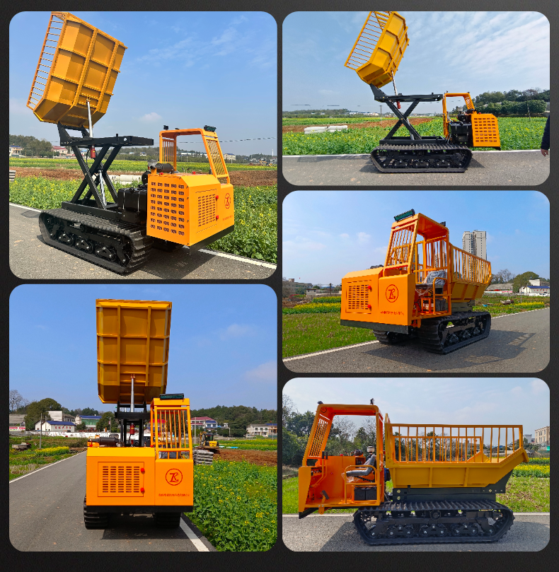 Scissor lift crawler dumper has a 2.5m dumping height,which helps you directly dump into a higher bin or truck and transport palm fruit,wood, sand, fruits, bamboo on complex terrains.